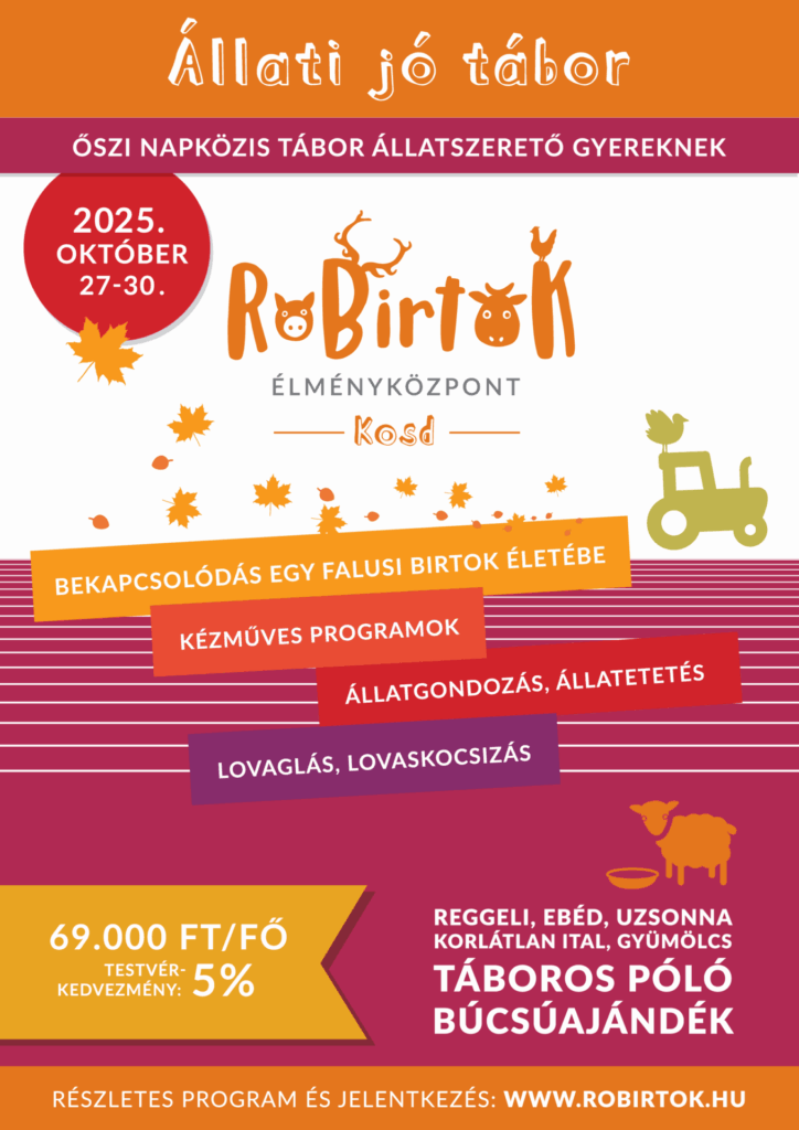 A 4 napos őszi táborozás alatt a gyerekek bekapcsolódhatnak egy falusi birtok életébe, saját tapasztalatokat szerezhetnek a falusi életről. Részt vehetnek az állatok gondozásában, kipróbálhatják a tehénfejést. Kézműves foglalkozások is színesítik programot. Az egyik nap a lovak körül forog, lesz lovaglás, a lovaskocsizás is. A tábor minden nap fél 8 és délután fél 5 között nyújt elfoglaltságot.